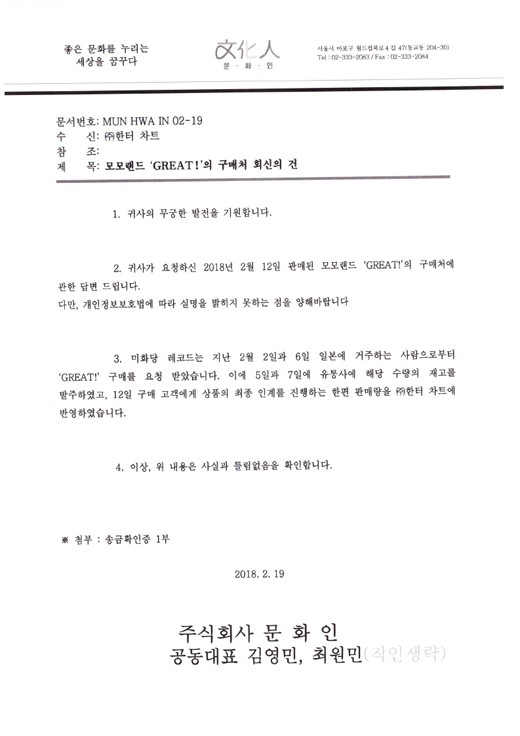 1번 이미지는 음반 소매점이 한터차트 측에 보낸 사실 확인서입니다. 인보이스 및 영수증을 첨부해 정상적인 과정으로 판매가 이루어졌음을 증명했습니다.