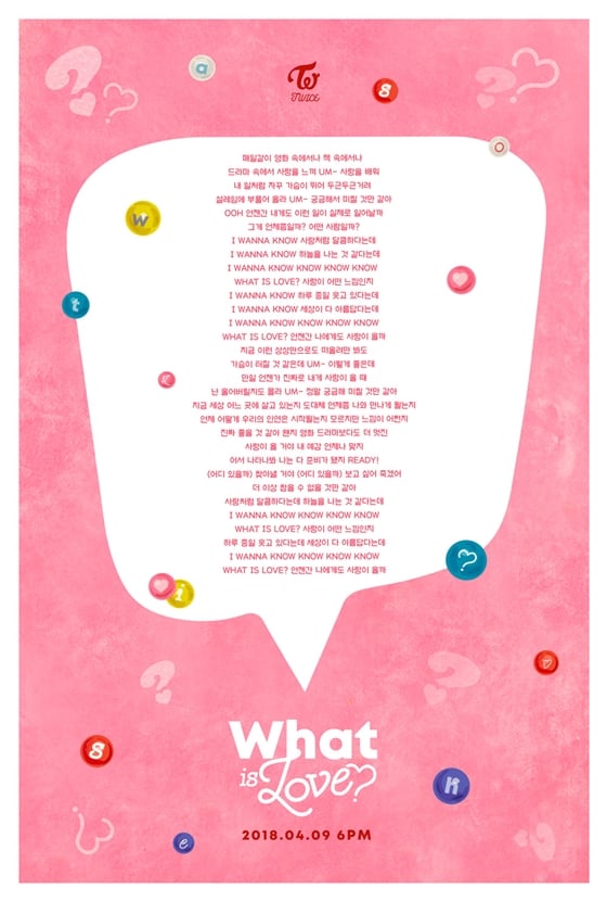 걸그룹 트와이스 미니 5집 타이틀곡 '왓 이즈 러브?(What is Love?)'의 전체 가사가 공개됐다.