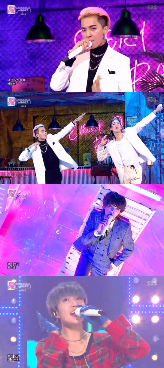 위너는 8일 오후 방송된 SBS 가요 순위 프로그램 '인기가요'에서 컴백 무대를 꾸몄다.
