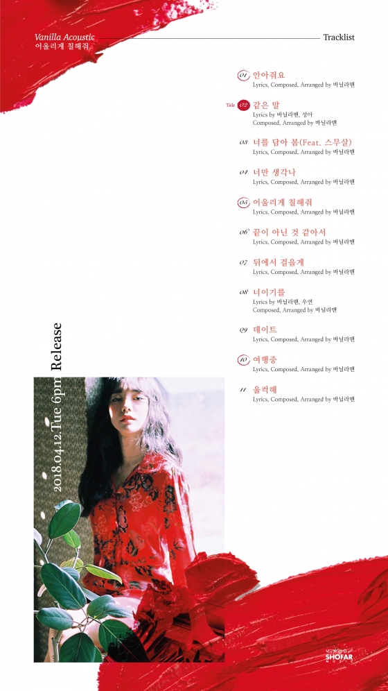 한편 바닐라 어쿠스틱은 지난 9일, 바닐라 어쿠스틱 및 쇼파르뮤직 공식 SNS 계정에 수록곡 ‘어울리게 칠해줘’ 티저 영상을 첫 공개해 관심을 모았다.