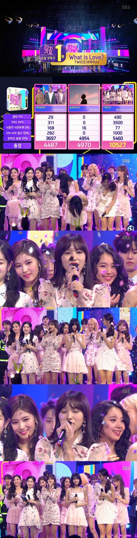 트와이스는 22일 오후 방송된 SBS 음악순위 프로그램 '인기가요'에서 '왓 이즈 러브'로 1위를 차지했다. 트와이스는 위너와 닐로를 제치고 1위에 올랐다.
