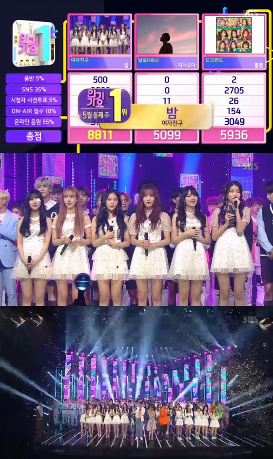 여자친구는 13일 방송된 SBS '인기가요'에서 신곡 '밤'으로 1위를 차지했다. 이날 '인기가요' 1위 후보로는 여자친구 '밤'과 닐로 '지나오다', 모모랜드 '뿜뿜'이 올라 경쟁했다.