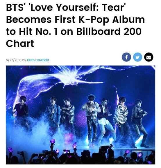 빌보드는 27일(현지시간) "방탄소년단이 한국 그룹 최초로 빌보드 200에서 1위를 차지했다(BTS' 'Love Yourself: Tear' Becomes First K-Pop Album to Hit No. 1 on Billboard 200 Chart)"와 "방탄소년단이 LOVE YOURSELF 轉 'Tear'로 빌보드 200에서 첫 1위를 따냈다('BTS Earns First No. 1 Album on Billboard 200 Chart With 'Love Yourself: Tear')"는 제목의 기사를 연이어 게재하고 방탄소년단의 빌보드 200 차트에서의 1위를 알렸다.
