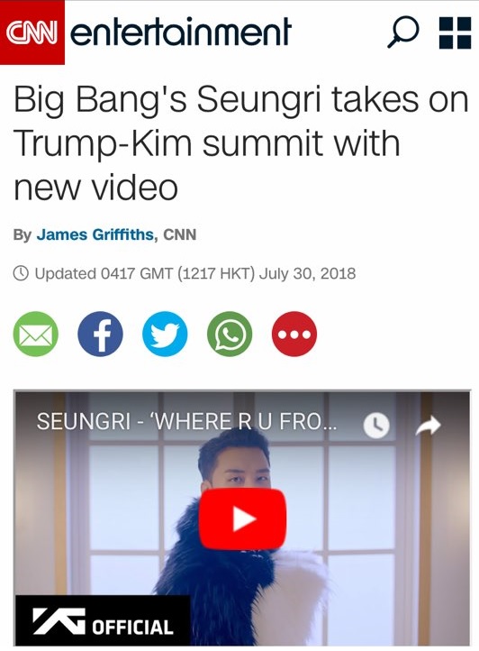 CNN은 30일(현지시간) 'Big Bang's Seungri takes on Trump-Kim summit with new video(새로운 뮤직비디오에서 북미 정상과 겨룬 빅뱅의 승리)'라는 제목으로 'WHERE R U FROM'의 뮤직비디오를 흥미로운 시각으로 분석했다.
