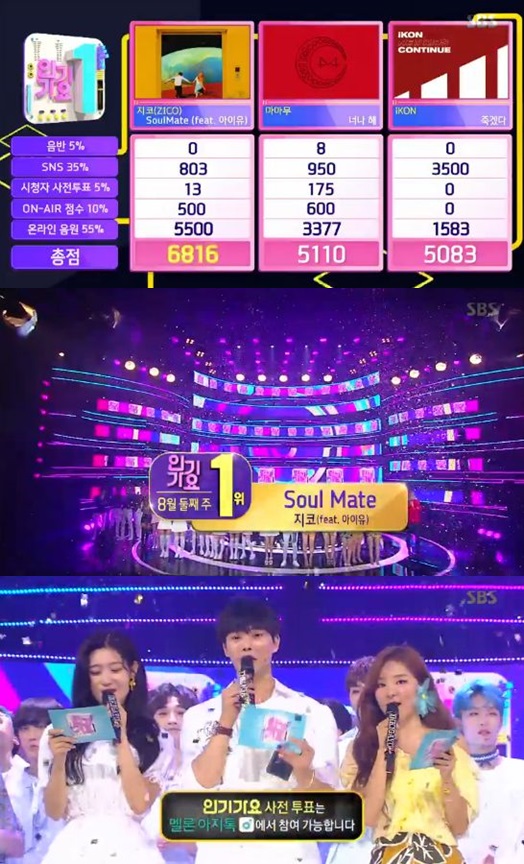 지코는 12일 오후 방송된 SBS 음악 프로그램 '인기가요'에서 신곡 '소울 메이트'(Soul Mate)로 마마무의 '너나 해'와 아이콘의 '죽겠다'를 제치고 8월 둘째 ·주 1위를 차지했다.