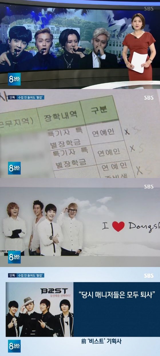 'SBS 8시 뉴스' 측은 동신대학교에 대해 "며칠 전 시의원이나 공무원들에게 각종 편의를 봐주고 학위를 줬다고 SBS가 의혹을 보도해드린 대학교다"며 "바쁜 스케줄에 출석하기 쉽지 않았을 텐데 학교는 공무원뿐 아니라 이런 아이돌까지 장학금을 주며 관리해왔다"고 전했다.