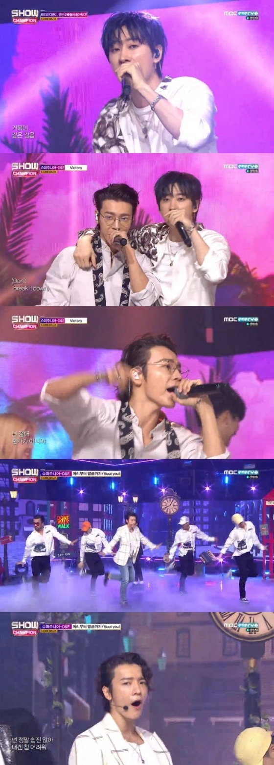 22일 오후 방송된 MBC 에브리원 '쇼챔피언'에서 슈퍼주니어 D&E가 신곡 '빅토리(Victory)'와 '머리부터 발끝까지('Bout you)' 무대를 꾸몄다.