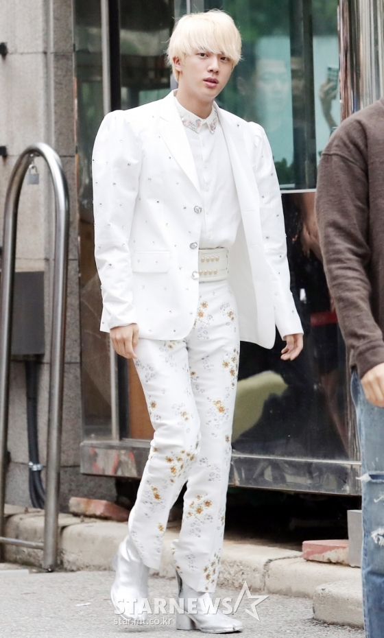 방탄소년단은 31일 오후 생방송으로 진행되는 KBS 2TV '뮤직뱅크' 무대에 서기 위해 서울 영등포구 여의도동 KBS 신관에 모습을 드러냈다. 이 중 진의 출근길 패션은 팬들과 취재진의 시선을 한눈에 사로잡았다. 이날 진은 화이트 컬러의 귀공자 스타일 패션을 완성한 룩으로 등장했기 때문이었다.