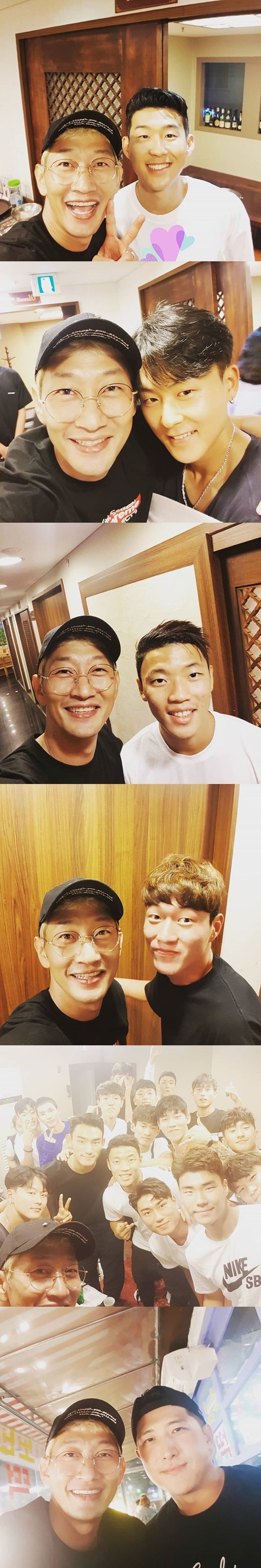 공개된 사진 속 김창열은 손흥민, 황희찬, 이승우, 황의조, 황재균, 2018 아시안게임 축구 국가대표팀 선수들과 함께 다정한 모습으로 포즈를 취하고 있다.