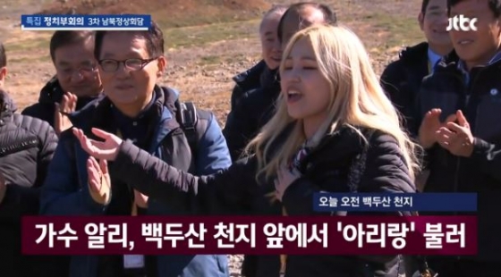 가수 알리가 백두산 천지에서 '진도 아리랑'을 열창, 문재인 대통령과 김정은 북한 국무위원회 위원장에게 깊은 감동을 선사했다.