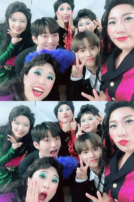프로젝트 그룹 셀럽파이브(송은이, 안영미, 신봉선, 김신영, 김영희)와 그룹 워너원 멤버 윤지성, 이대휘 /사진=신봉선 인스타그램
