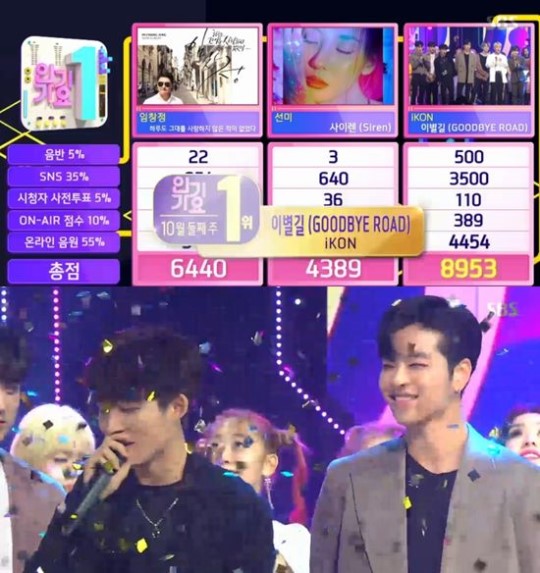 그룹 아이콘이 '이별길'로 '인기가요' 1위를 차지했다.