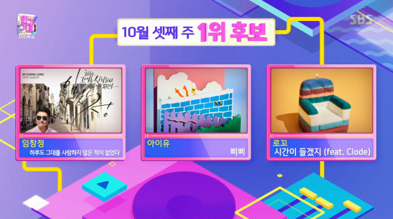 임창정, 아이유, 로꼬가 SBS '인기가요' 10월 셋째 주 1위 후보에 올랐다.