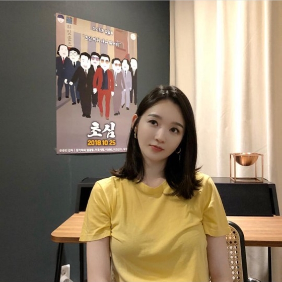 사진 속 강민경은 장기하와 얼굴들 5집 포스터 앞에서 자세를 취했다. 맑은 피부와 청순한 매력으로 시선을 끌었다.