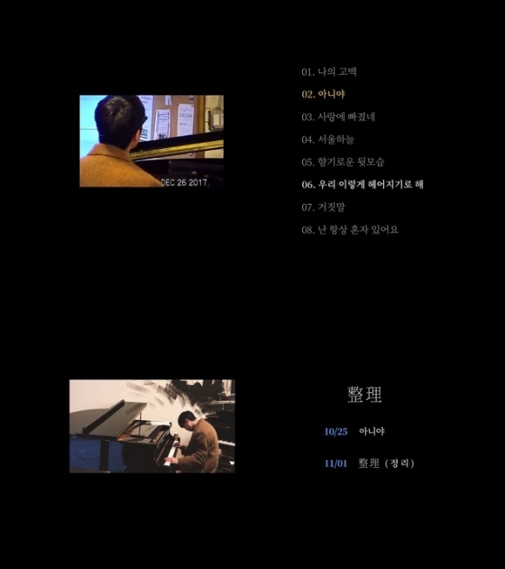 영상에 따르면 정준일은 지난 1997년 발매된 나원주 '나의 고백'을 시작으로, 2014년 발매한 본인의 자작곡 '아니야', 1999년 발매된 김현철 '사랑에 빠졌네', 1997년 발매된 조규찬 '서울하늘', 2001년 발매된 The Story 이승환 '향기로운 뒷모습', 2000년 발매된 동물원 '우리 이렇게 헤어지기로 해', 1998년 발매된 이규호 '거짓말', 2013년 발매된 고찬용 '난 항상 혼자 있어요'까지 총 8곡의 리메이크 트랙을 이번 앨범에 수록했다.