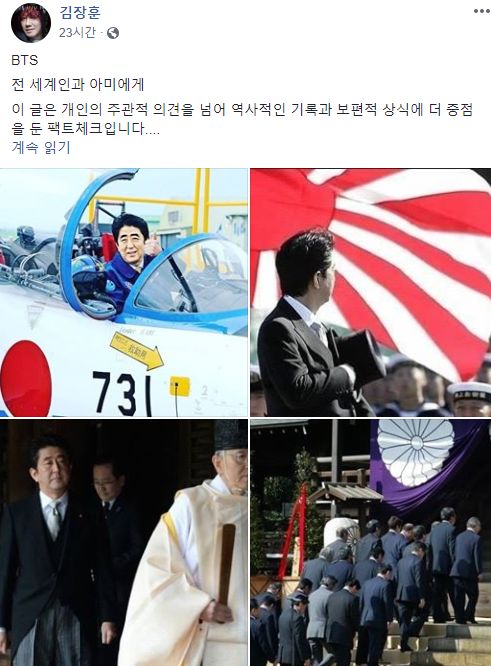 김장훈은 지난 14일 자신의 페이스북에 한국어, 영어, 일본어 등 3개 국어로 최근 일본에서 불거진 방탄소년단의 방송 출연 불발과 관련 자신의 생각을 밝혔다. 그는 "지금 일본에서는 일부매체의 악의적인 보도와 방송출연무산 등, 비상식적인 일들이 일어나고 있다"고 지적한 뒤 "저는 이 문제를 BTS나 한일의 문제가 아닌 올바른 역사관, 상식, 인류애적인 측면으로 이해하기를 바란다"고 했다.