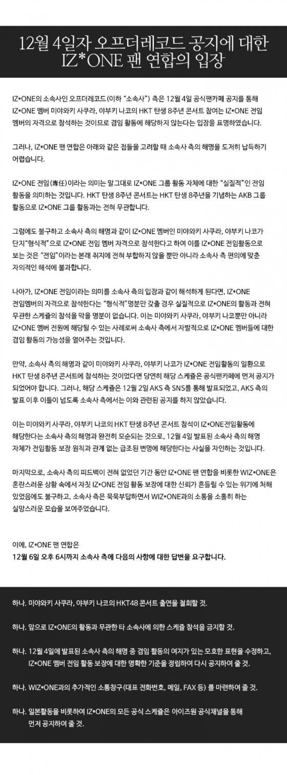 아이즈원 팬연합은 이와 함께 미야와키 사쿠라, 야부키 나코의 HKT 48 콘서트 출연을 철회하고 IZ*ONE 활동과 무관한 스케줄 참석을 금하며 IZ*ONE 멤버 전임 활동 보장에 대한 명확한 기준을 정립해 공지할 것을 요구했다.