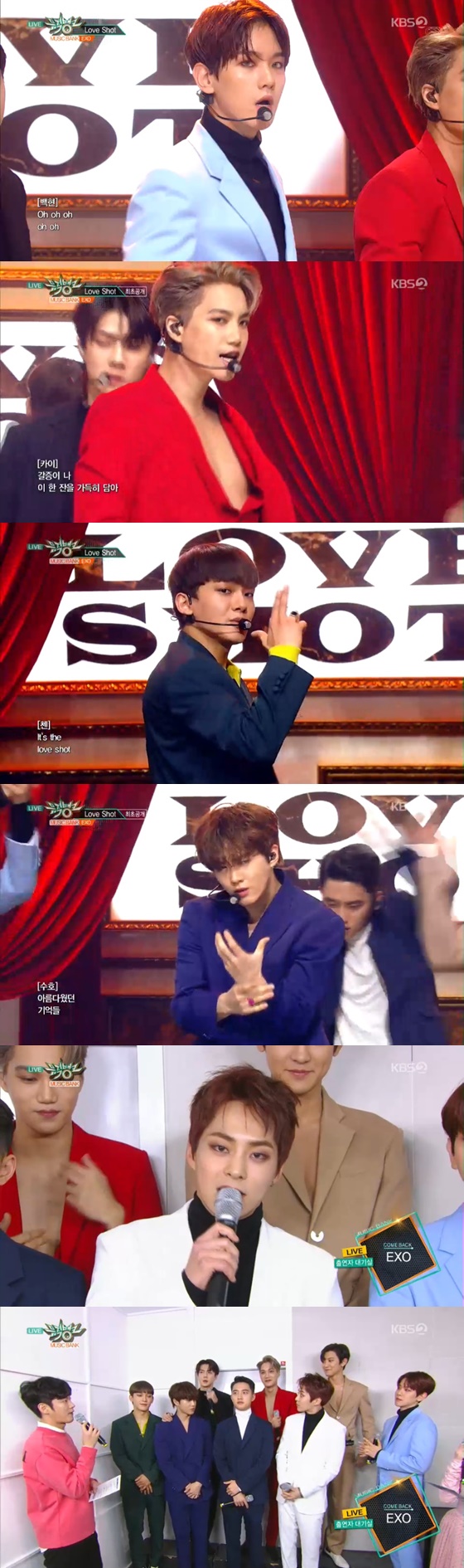 14일 오후 방송된 KBS 2TV 음악 순위 프로그램 '뮤직뱅크'에서는 그룹 엑소가 곡 'Love Shot'(러브 샷)으로 컴백 무대를 꾸몄다.