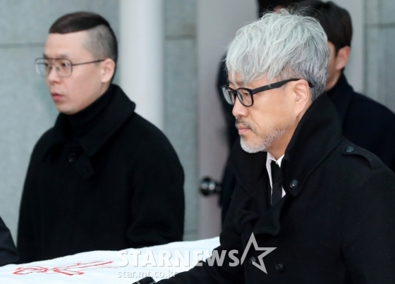 가수 김종진, 나얼이 31일 오전 송파구 서울아산병원에서 엄수된 밴드 봄여름가을겨울의 드러머 고 전태관의 발인식에서 운구행렬하고 있다./사진=홍봉진 기자