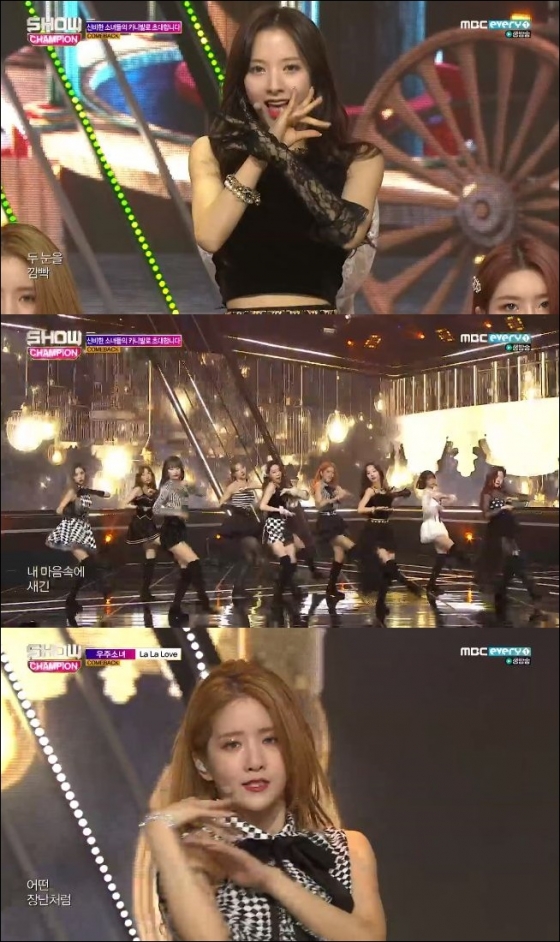 16일 오후 방송된 MBC 에브리원 '쇼 챔피언'에서 우주소녀가 곡 'La La Love' 무대를 펼쳤다.