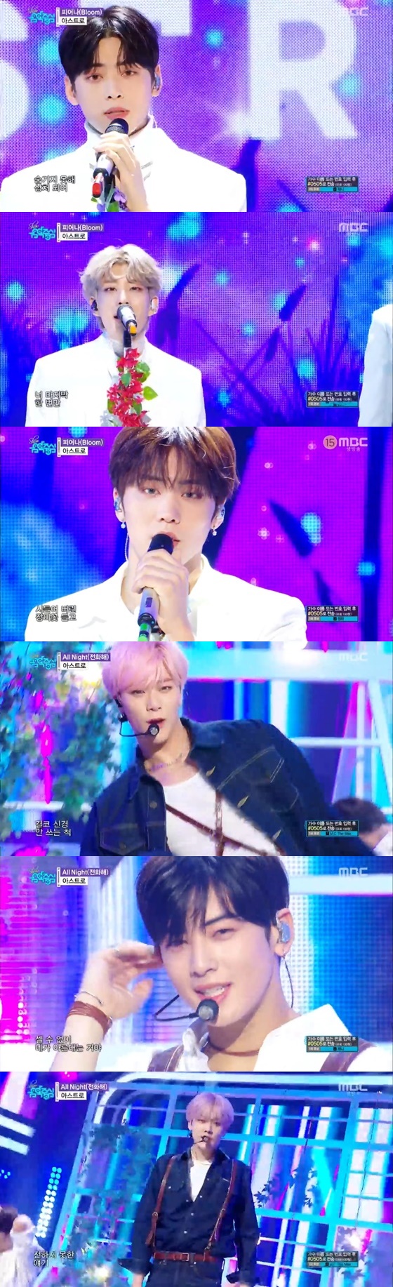 이날 방송에서 아스트로는 '피어나'로 먼저 컴백 무대 포문을 열었다. 이들은 흰 수트를 입고 상처 받은 남자의 아픔을 그려냈다. 이어 'All Night'(전화해)로 무대를 꾸몄다. 이들은 청패션으로 발랄한 매력을 뽐냈다.
