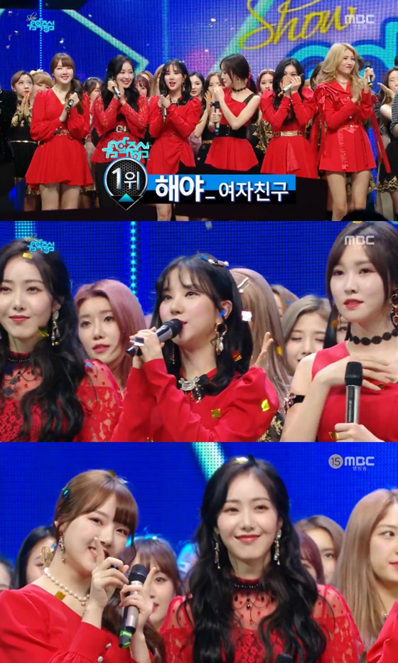 여자친구는 26일 오후 생방송 된 MBC '쇼! 음악중심'(이하 '음악중심')에서 노래 '해야'로 엠씨 더 맥스(M.C The Max)의 '넘쳐흘러', 청하의 '벌써 12시' 등과 1위 후보에 올랐다.