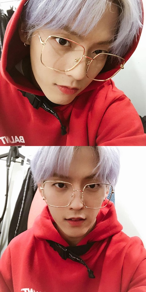 사진 속에는 빨간 후드티를 입고 있는 이민혁의 모습이 담겨 있다. 삭발 전 보랏빛 머리가 눈길을 끈다.
