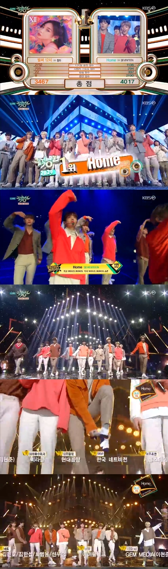 8일 오후 방송된 KBS 2TV 음악 순위 프로그램 '뮤직뱅크'에서 세븐틴이 곡 'Home'으로 방송 2주 연속 1위, 통합 7관왕을 달성했다.