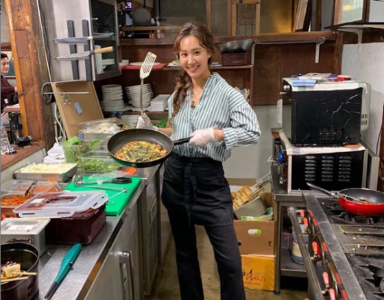 사진 속 유리는 부침개가 든 프라이팬을 들고 활짝 웃으며 카메라를 응시하고 있다. 특히 앞치마를 했음에도 드러나는 우월한 비율이 눈길을 끈다.