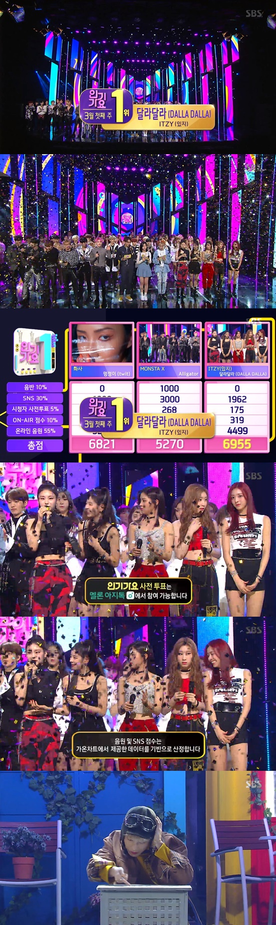 3일 오후 방송된 SBS 음악순위 프로그램 '인기가요'에서는 화사의 '멍청이', 몬스타엑스의 '엘리게이터', ITZY의 '달라달라'가 1위 후보에 올랐다.