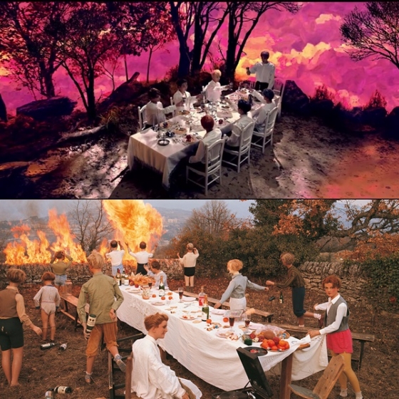 '영 포에버' 밤 버전에서도 역시 앨범에 담긴 대형 포스터에 찍힌 '캠프 파이어' 장면이 유사하다는 지적이다. 짙은 어둠 속에 환히 비추는 불빛의 모습과 구도 등이 포인트다. 베르나르 포콩은 그간 불에 남다른 의미를 부여해 이를 작품에 활용해왔다.