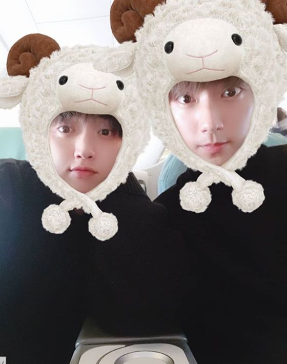 사진 속 산들과 공찬은 애플리케이션을 활용해 양머리를 머리에 두른 채 카메라를 응시하며 귀여운 매력을 뽐냈다.