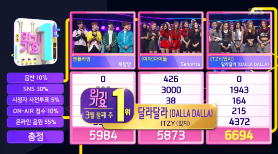 ITZY는 10일 방송된 SBS '인기가요'에서 1위를 차지했다. 후보로는 엔플라잉 '옥탑방', (여자)아이들 '세뇨리타', ITZY '달라달라'가 올랐다.