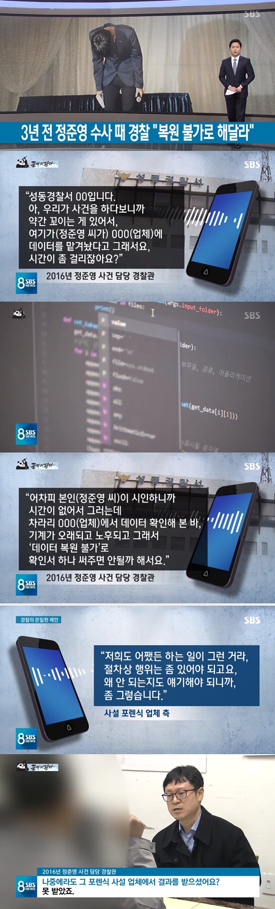당시 수사하던 성동경찰서의 사건 담당 경찰관은 디지털 포렌식 업체에 직접 전화해 "우리가 사건을 하다보니까 꼬이는게 있다. 여기가 정준영이 데이터를 맡겼다고 하는데 시간이 걸리지 않느냐?"라며 "어차피 본인(정준영)이 시인하니까, 시간이 없어서 그러는데 차라리 업체에서 데이터 확인해 본 결과 기계가 오래되고 노후되고 그래서 '데이터 복원 불가'로 확인서 하나 써주면 안될까 해서요"라고 요구했다. 사설 포렌식 업체 측에서 "저희도 절차상 행위는 있어야 해서 좀 그렇다"라고 거절했다.