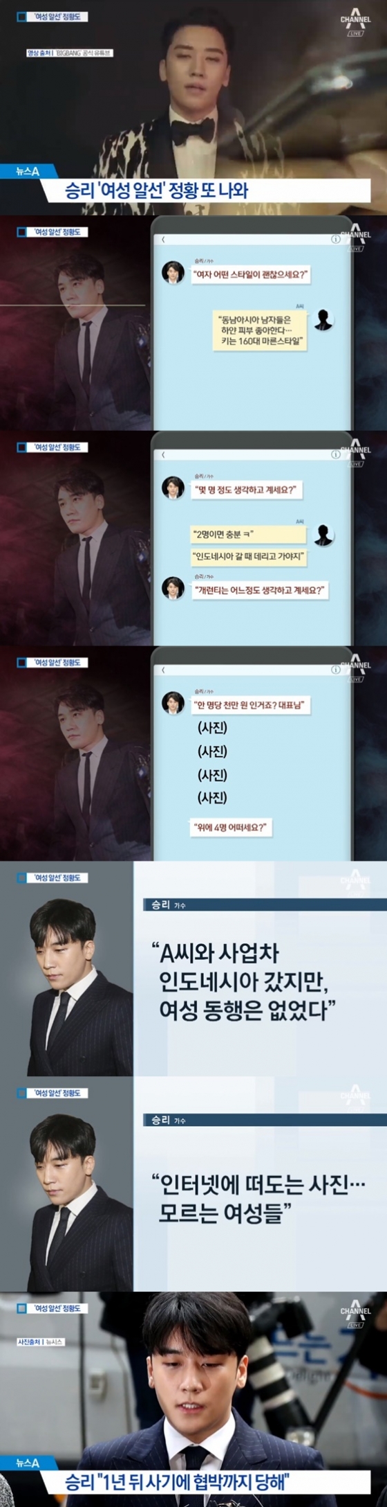 15일 채널A에 따르면 승리 측 변호인은 승리의 해외 성매매 알선 의혹에 대해 "해당 사업가 A씨와 업무차 인도네시아에 간 적은 있지만 여성은 동행한 적 없다"라며 "인터넷에 떠도는 모르는 여성들의 사진을 보냈다. 해당 사업가에게 20억원의 돈이 묶여있어서 잘 보이려고 허풍을 떤 것이다"라고 말했다.