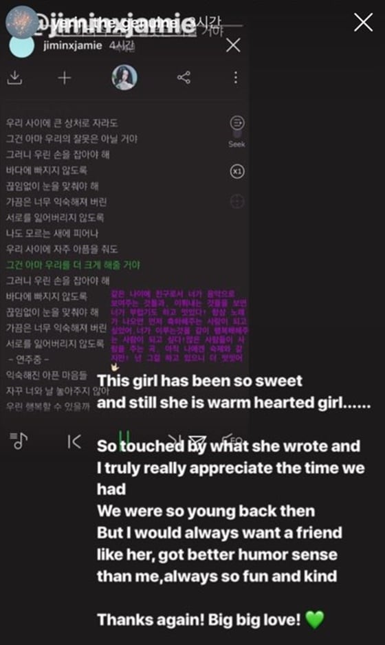 백예린은 19일 자신의 인스타그램을 통해 박지민이 보낸 응원글을 게재하며 "이 소녀(박지민)는 너무 달콤하고 따뜻한 마음을 가졌다"라고 적은 영문 메시지를 덧붙였다.
