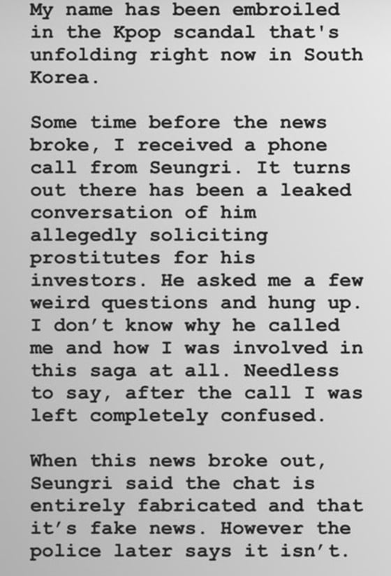 그는 지난 23일(한국시간) 자신의 SNS에 승리 사건과 관련돼 자신이 함께 언급되는 상황에 대해 해명글을 올렸다.