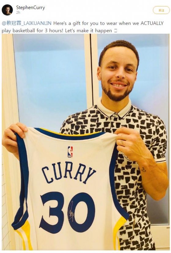 NBA 스타 스테판 커리가 그룹 워너원 출신 라이관린에게 자신의 유니폼을 선물하며 만나자는 뜻을 전했다.