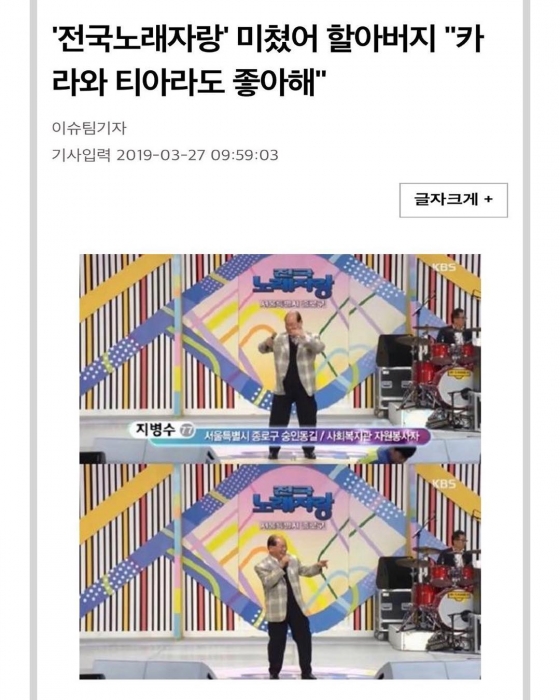 지병수 할아버지는 27일 CBS 라디오 '김현정의 뉴스쇼' 인터뷰를 통해 카라의 '미스터'와 티아라의 '러비더비'도 좋아한다고 전했다.
