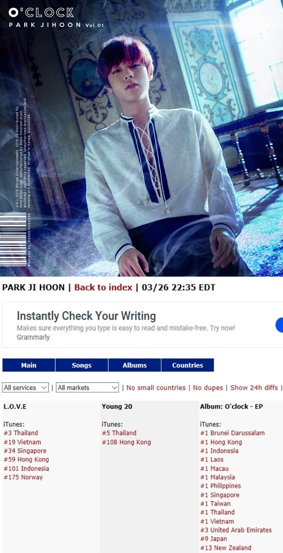 박지훈의 첫 솔로 미니앨범 'O’CLOCK'이 다수의 해외 아이튠즈 앨범 차트에서 1위를 기록했다.