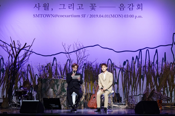첸은 1일 오후 3시 서울 강남구 삼성동 코엑스아티움에서 첫 솔로 앨범 '사월, 그리고 꽃 (April, and a flower)' 발매 기념 음감회를 개최하고 신곡 무대를 선보였다.