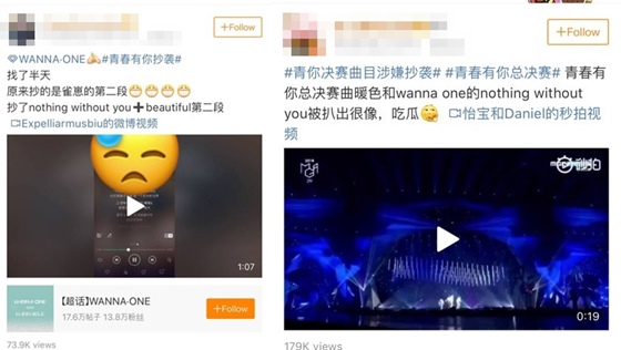 문제가 된 곡은 '난색'. 이 곡은 방송 직후 중국 온라인상에는 "워너원의 노래 '낫씽 위드아웃 유(Nothing Without You)'와 멜로디가 유사하다"는 반응들이 쏟아졌다.