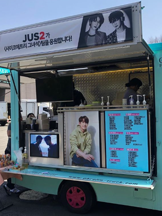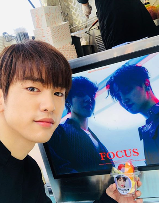 사진 속 진영은 JUS2 멤버들이 보내준 커피차 앞에서 인증샷을 찍고 있다. 특히 진영은 훈훈한 비주얼을 뽐내 여심을 저격하고 있다.