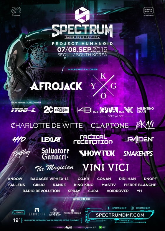 이번 '2019 스펙트럼' 라인업에는 노르웨이 출신의 트로피컬 하우스 DJ로 세계적인 히트 싱글 'It Ain't Me'로 2015년 노벨 평화상 시상식 공연과 2016년 하계 브라질 올릭픽 폐막식 공연에 초청된 카이고(Kygo)와 비욘세, 마돈나 등 세계적인 팝 스타들과 작업으로 EDM을 대중들에게 더 가까이 다가갈 수 있게 했다는 평가를 받는 아프로잭(Afrojack)이 이름을 올렸다.