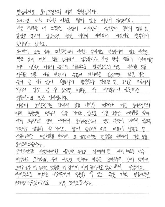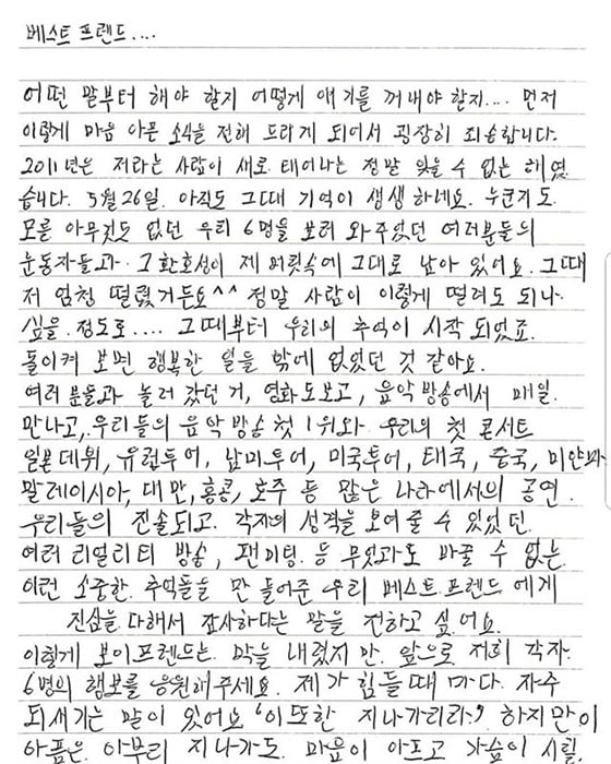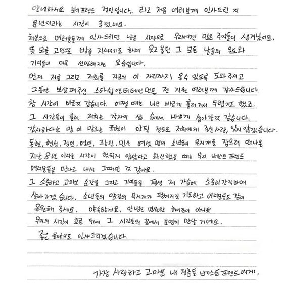그룹 보이프렌드(동현 현성 정민 영민 광민 민우)가 계약 종료로 8년 간 활동을 마감했다. 이에 멤버들은 자필 편지를 통해 팬들에게 고마운 마음을 표현했다.