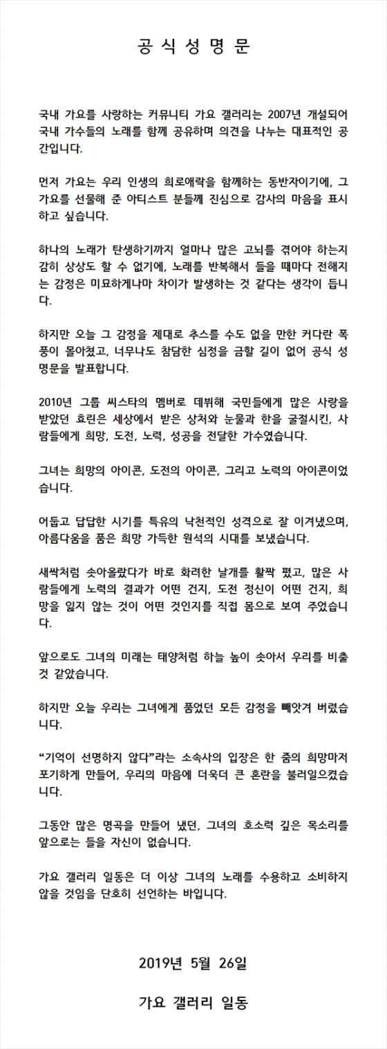 끝으로 가요 갤러리는 "기억이 선명하지 않다'라는 소속사의 입장은 한 줌의 희망마저 포기하게 만들어, 우리의 마음에 더욱더 큰 혼란을 불러일으켰다"며 "그동안 많은 명곡을 만들어 냈던, 그녀의 호소력 깊은 목소리를 앞으로는 들을 자신이 없다. 가요 갤러리 일동은 더 이상 그녀의 노래를 수용하고 소비하지 않을 것임을 단호히 선언하는 바이다"라고 전했다.