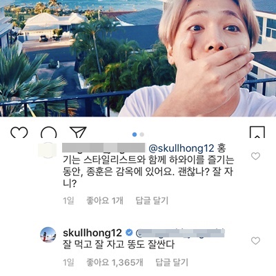 푸른 바다와 하늘을 배경으로 즐거워 보이는 사진을 공개했다. 이홍기가 "Back to home..i’ll miss you"(집으로. 그리울거야)라고 쓴 글 아래에는 한 일본팬이 남긴 댓글이 달렸다. 최종훈의 팬으로 추측되는 이 네티즌은 "홍기는 스타일리스트와 함께 하와이를 즐기는 동안, 종훈은 감옥에 있어요. 괜찮나? 잘 자니?"라고 썼다.