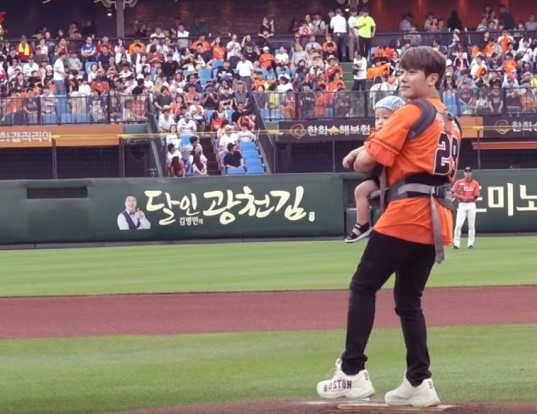 이날 최민환 율희 부부는 한화 이글스 유니폼을 입고 아들 재율 군과 함께 야구장에 들어섰다. 이후 최민환은 재율 군을 아기띠로 안고 그라운드에 올라섰다.