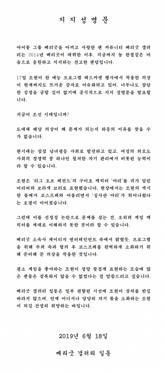 18일 한 온라인 팬 커뮤니티 '베리굿 갤러리'에는 '조현에 대한 지지 성명 발표한다'는 제목의 성명문이 게재됐다.