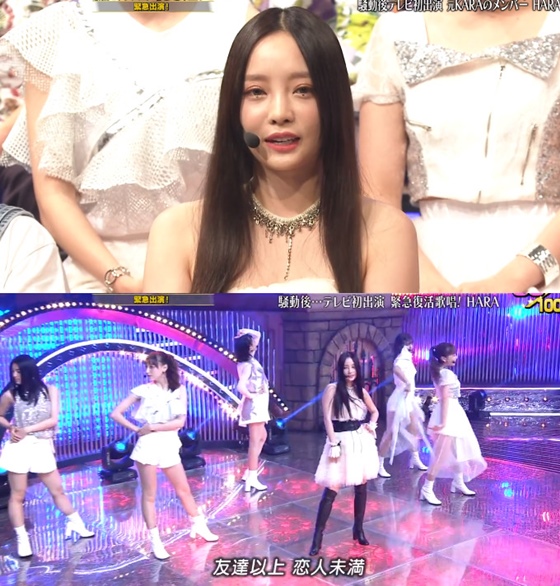 새 출발을 알린 구하라는 지난 26일 일본 TV도쿄 '테레토 음악제 2019'에 출연했다. 이날 방송에서 아라시, 킨키키즈, 브이식스, 킹앤프린스, AKB48, 노기자카46, 모닝구무스메19 등과 어깨를 나란히 한 구하라는 튜브톱 드레스를 입고 카라의 히트곡 '미스터'를 불렀다.